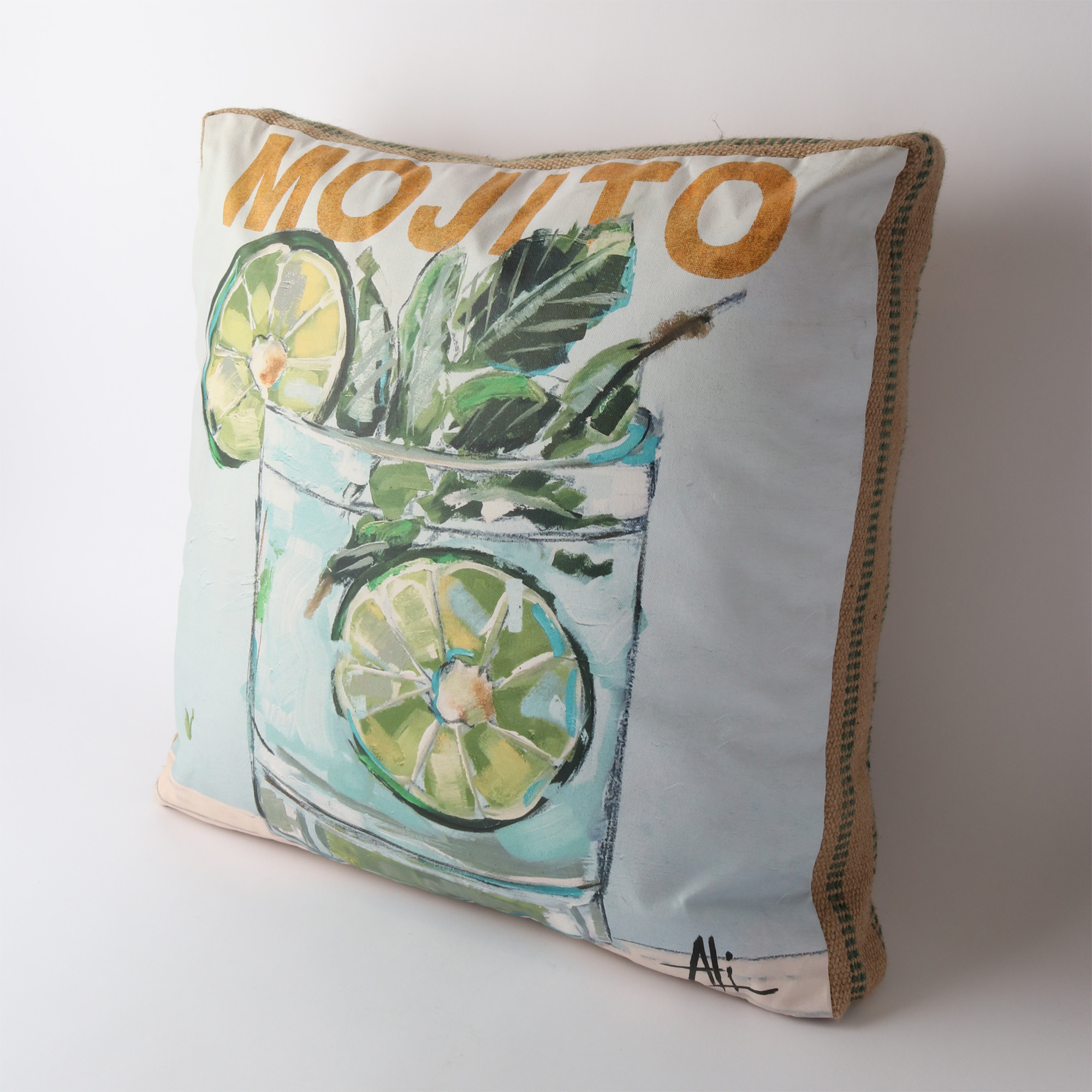 Printed Linen, Burlap Side + Feather/Dacron Fill. Includes Artist Bio